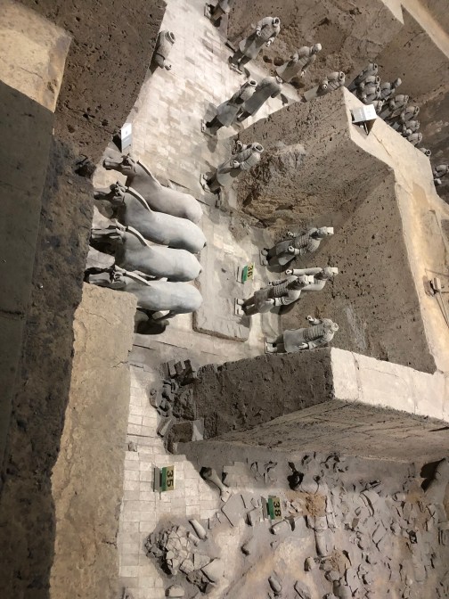 The museum consists of 3 pits located close to each other: pit 1 is well restored, at pit 2 you can see ongoing excavation works while pit 3 (commanding centre) is the smallest. The sheer concept of emperor Qin Shi Huang’s mausoleum is mind-boggling! The first emperor of China is not only buried with his entire army to protect him in afterlife but his war/army strategies are replicated with intricate details against potential attacks from the east! The museum itself felt a bit underwhelming to me– its the concept and the fact that this was built in 210 BC as funerary art is definitely more impressive that the restored stuff. I enjoyed the landscape surrounding the area- pretty mountains and cherry blossom trees in full bloom. Regular shuttles run between the pits and the emperor’s mausoleum. The latter is surrounded by lush greenery and gardens.